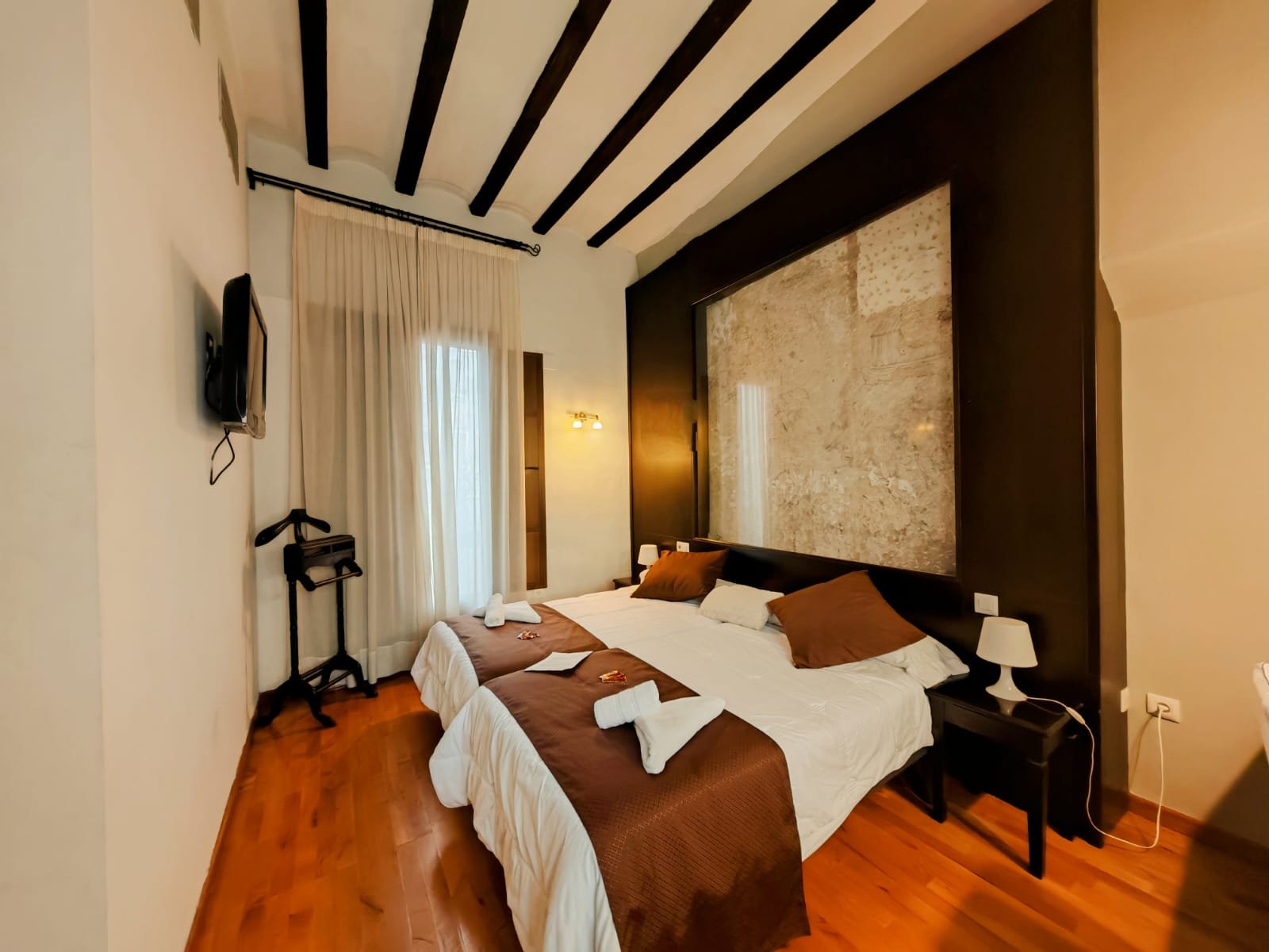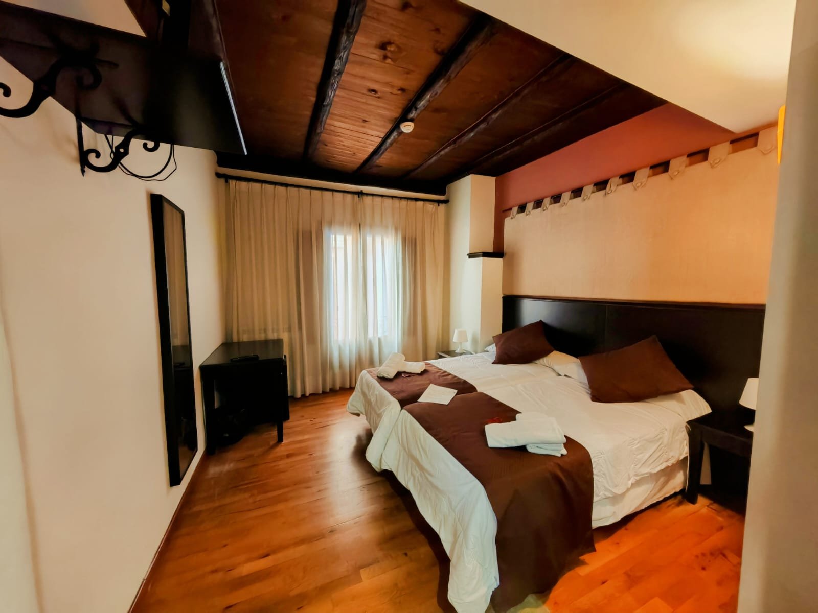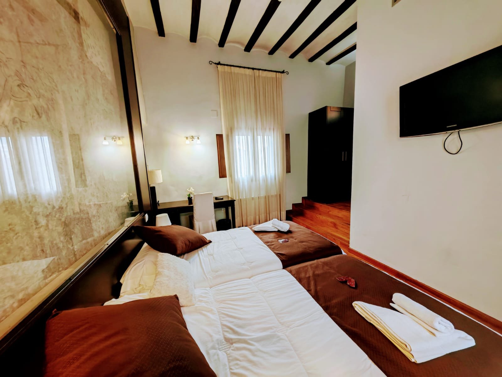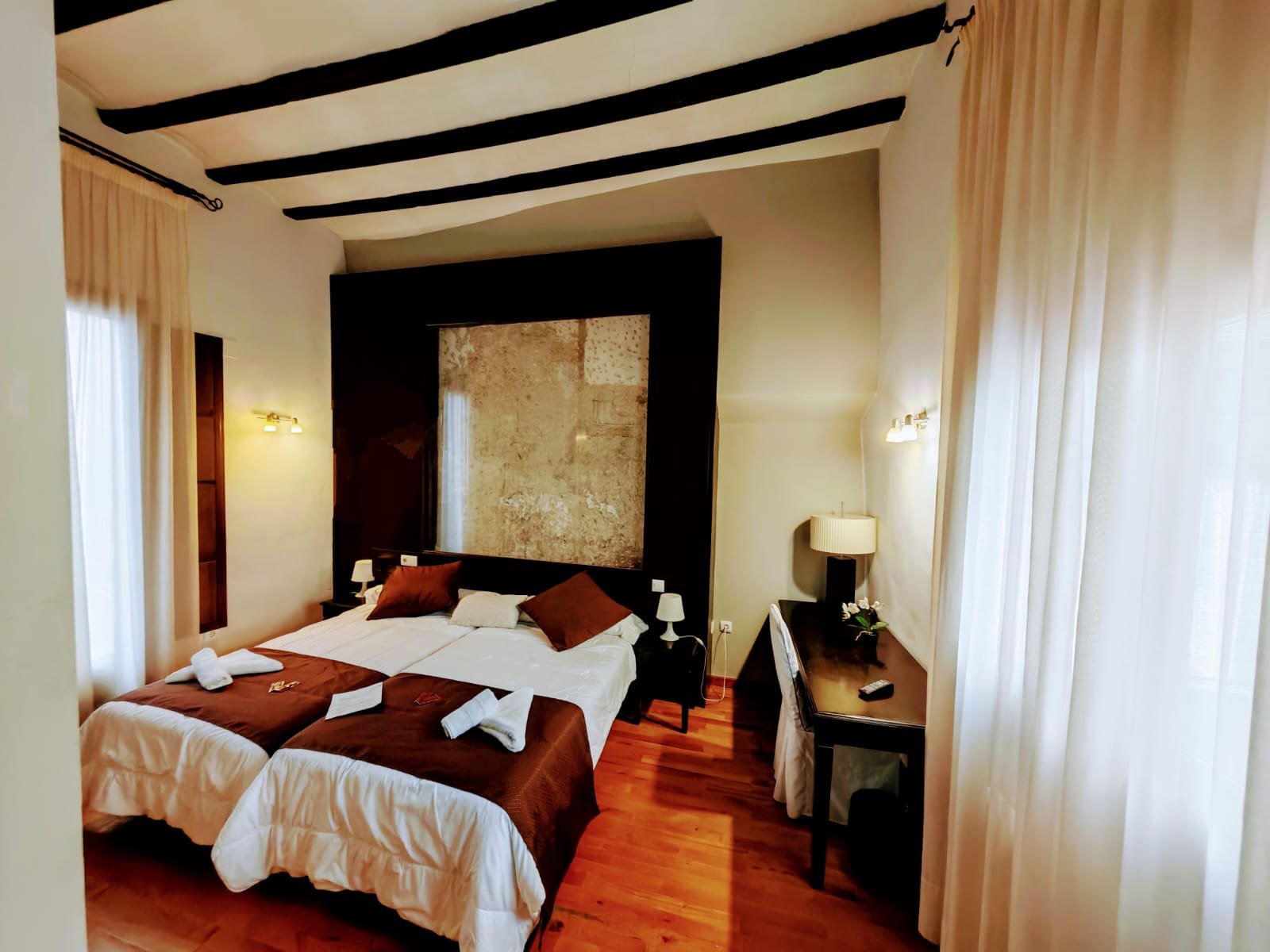 Hotel con encanto distribuido en Siete habitaciones todas con baño completo, aire acondicionado con bomba de calor. Cuatro de las habitaciones tiene sala de estar dos ellas son dobles. Se pueden convertir en triples y una individual. Todas ellas con unas vistas espectaculares y una de ellas es la joya de la posada por su luz, sus vistas y por el mural de pinturas tardo góticas que representan el diluvio universal.