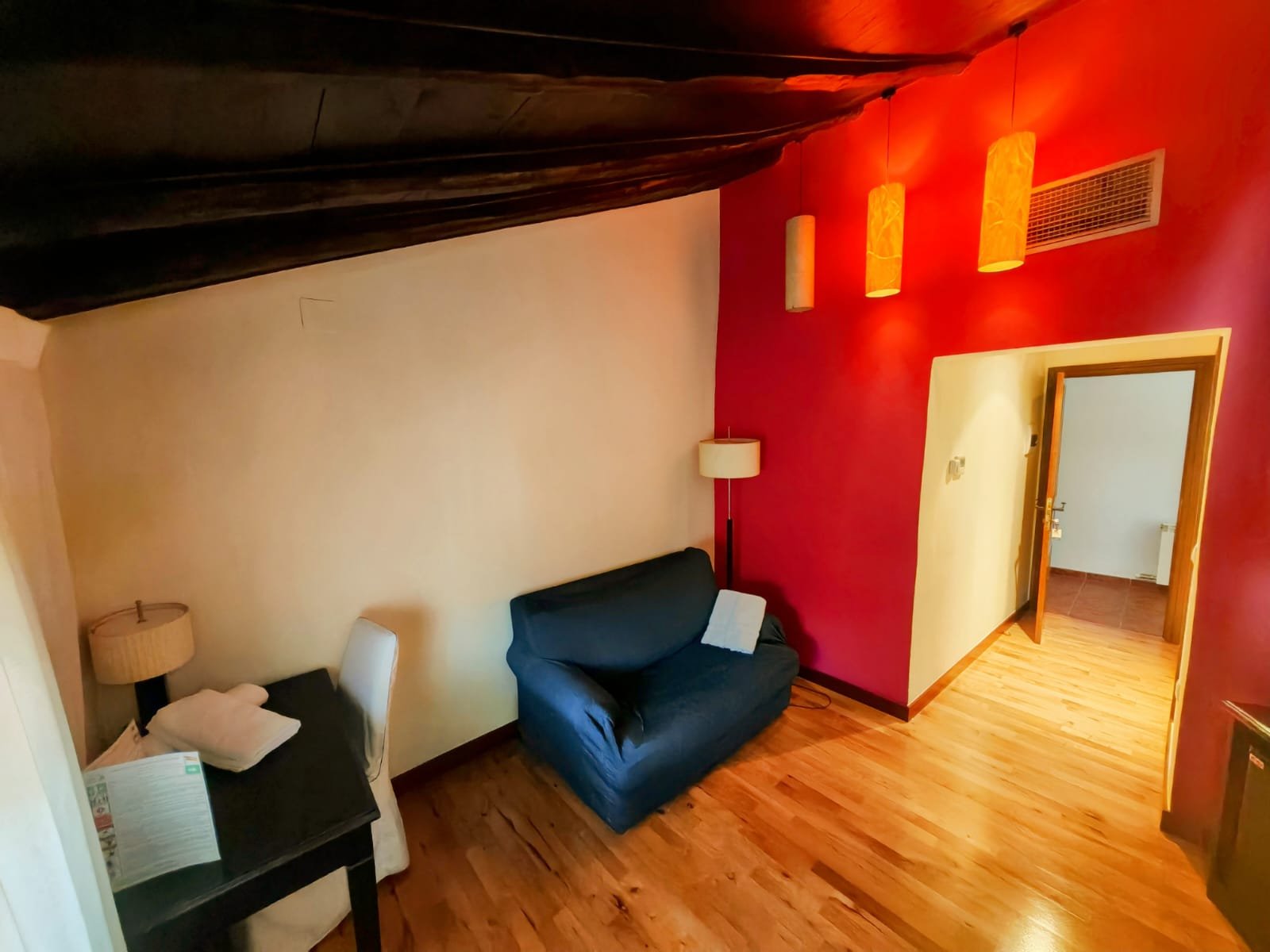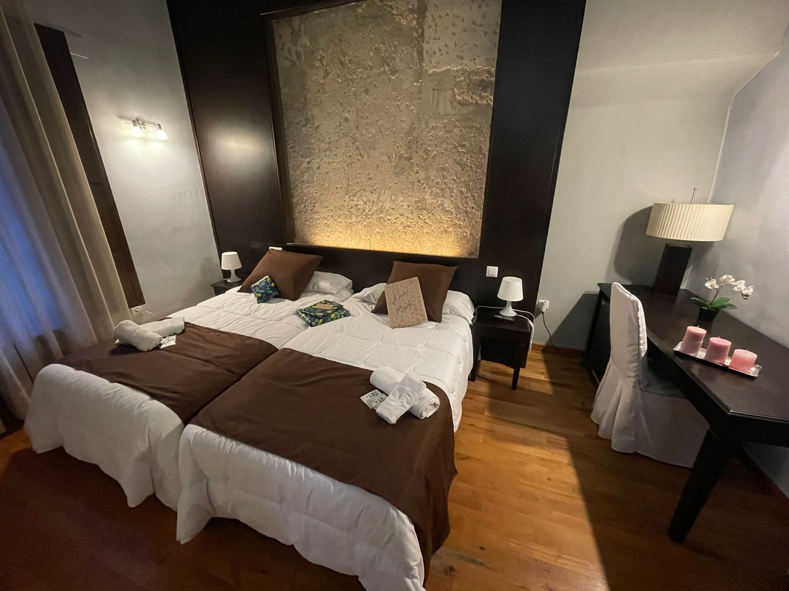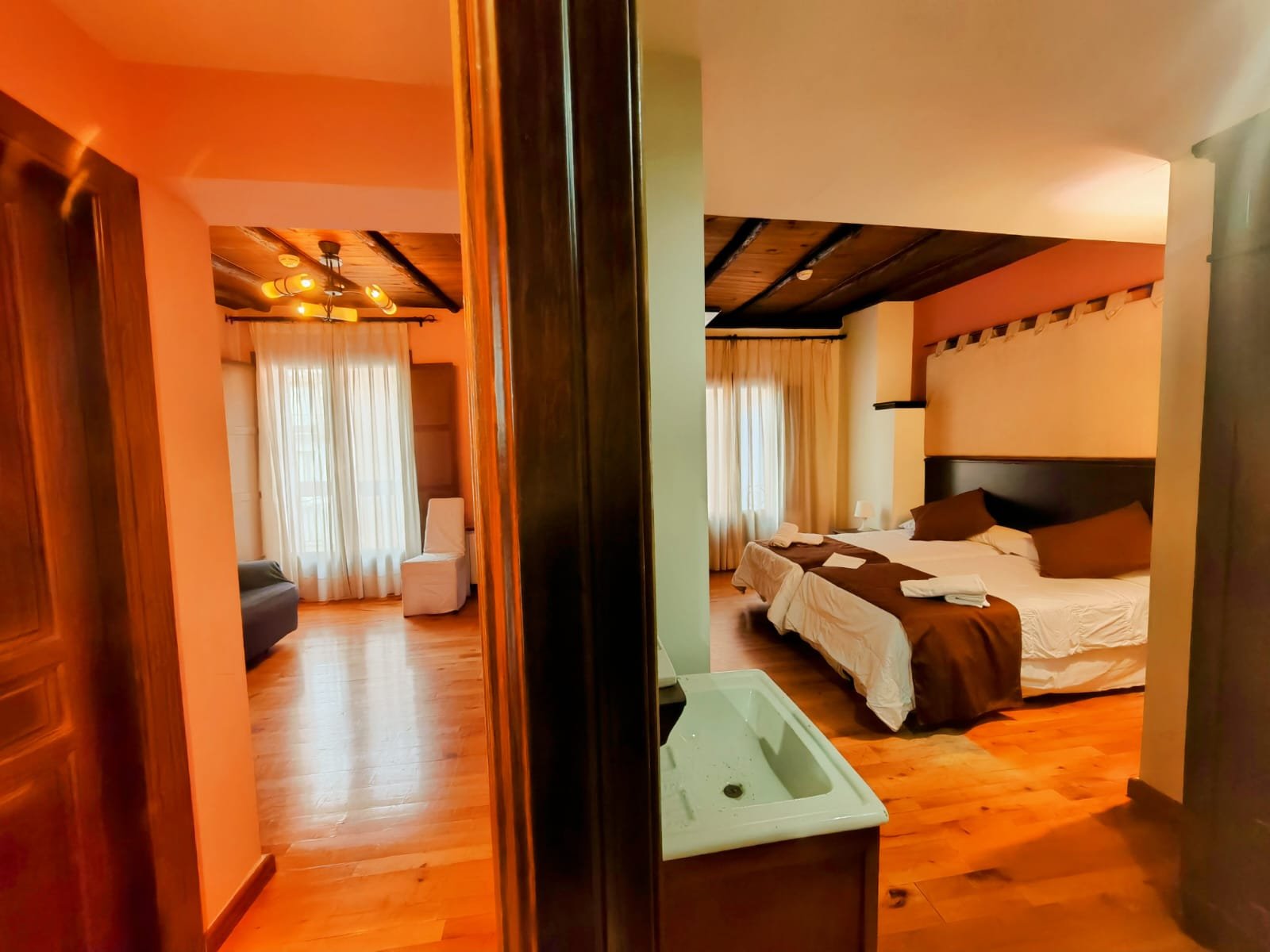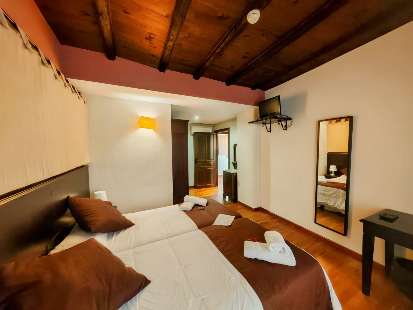 Hotel con encanto distribuido en Siete habitaciones todas con baño completo, aire acondicionado con bomba de calor. Cuatro de las habitaciones tiene sala de estar dos ellas son dobles. Se pueden convertir en triples y una individual. Todas ellas con unas vistas espectaculares y una de ellas es la joya de la posada por su luz, sus vistas y por el mural de pinturas tardo góticas que representan el diluvio universal.